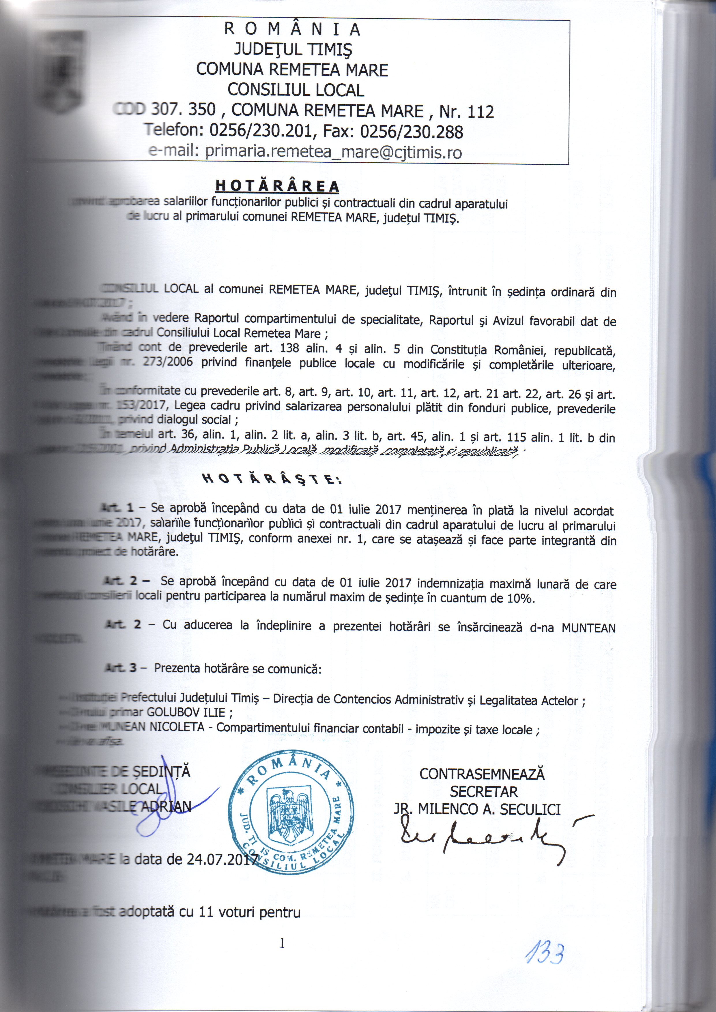 HCL NR. 26 PRIVIND SALARIZAREA PERSONALULUI DIN CADRUL PRIMARIEI COMUNEI REMETEA MARE
