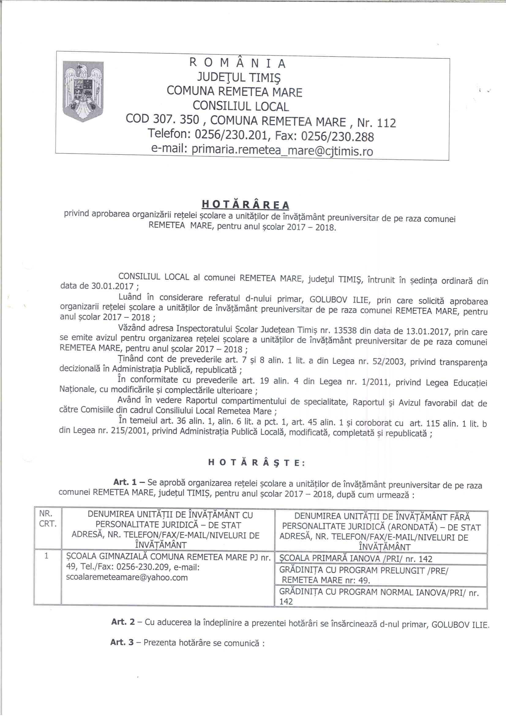 HCL ORGANIZARE REȚEA ȘCOLARĂ